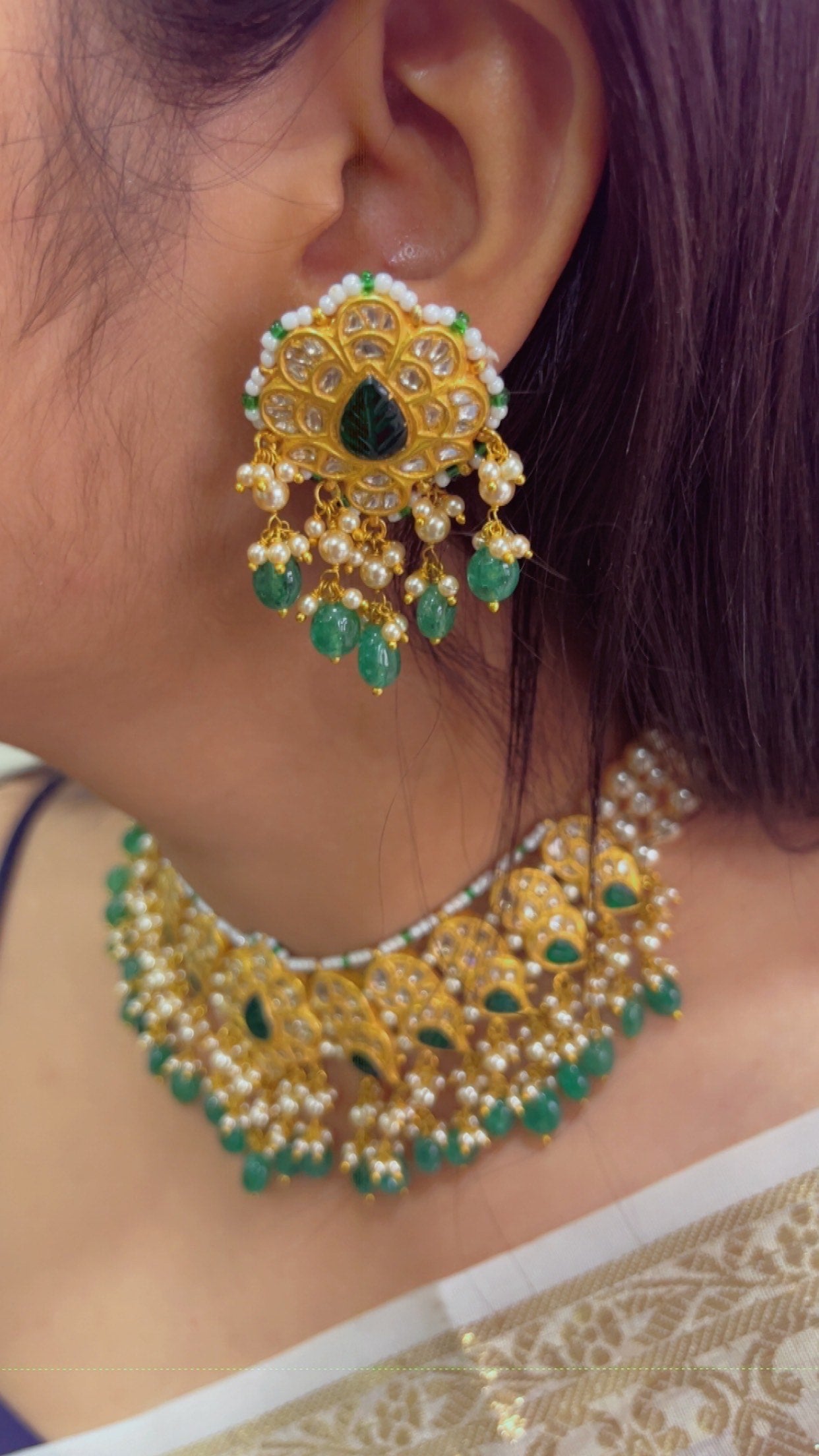 22K Gold Hallmarked Diamond Polki Green Choker Necklace Jewelry