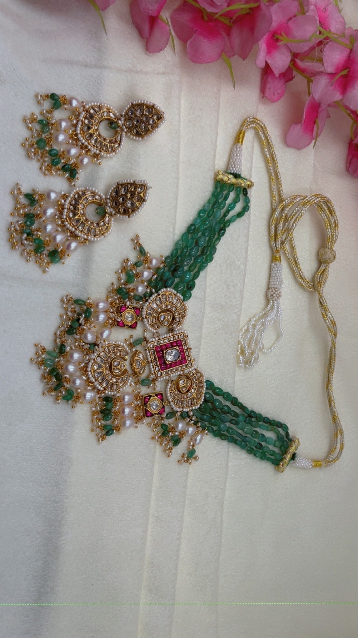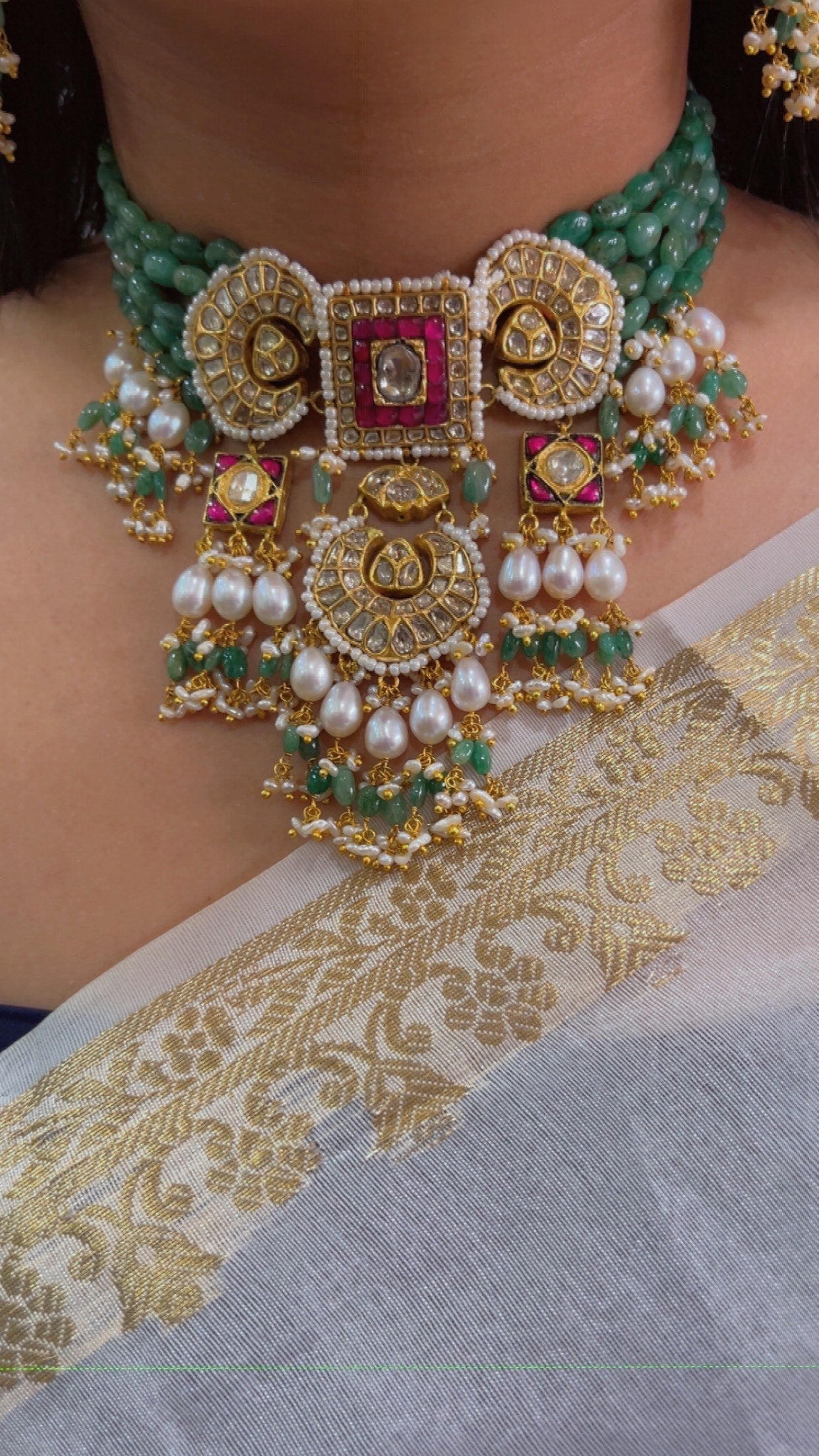 22K Gold Hallmarked Diamond Polki Green Choker Necklace Jewelry