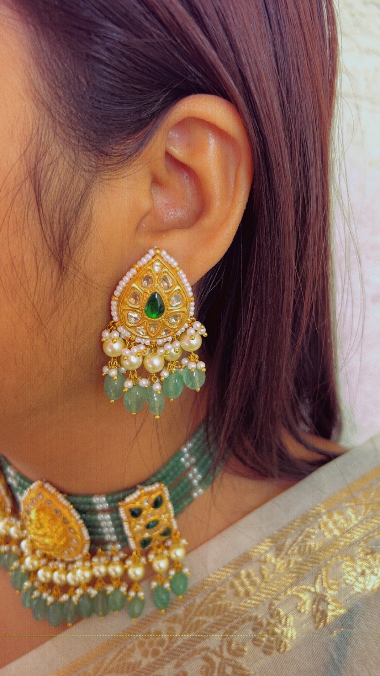 Crafted in 22kt gold with natural polki diamonds and gemstones.