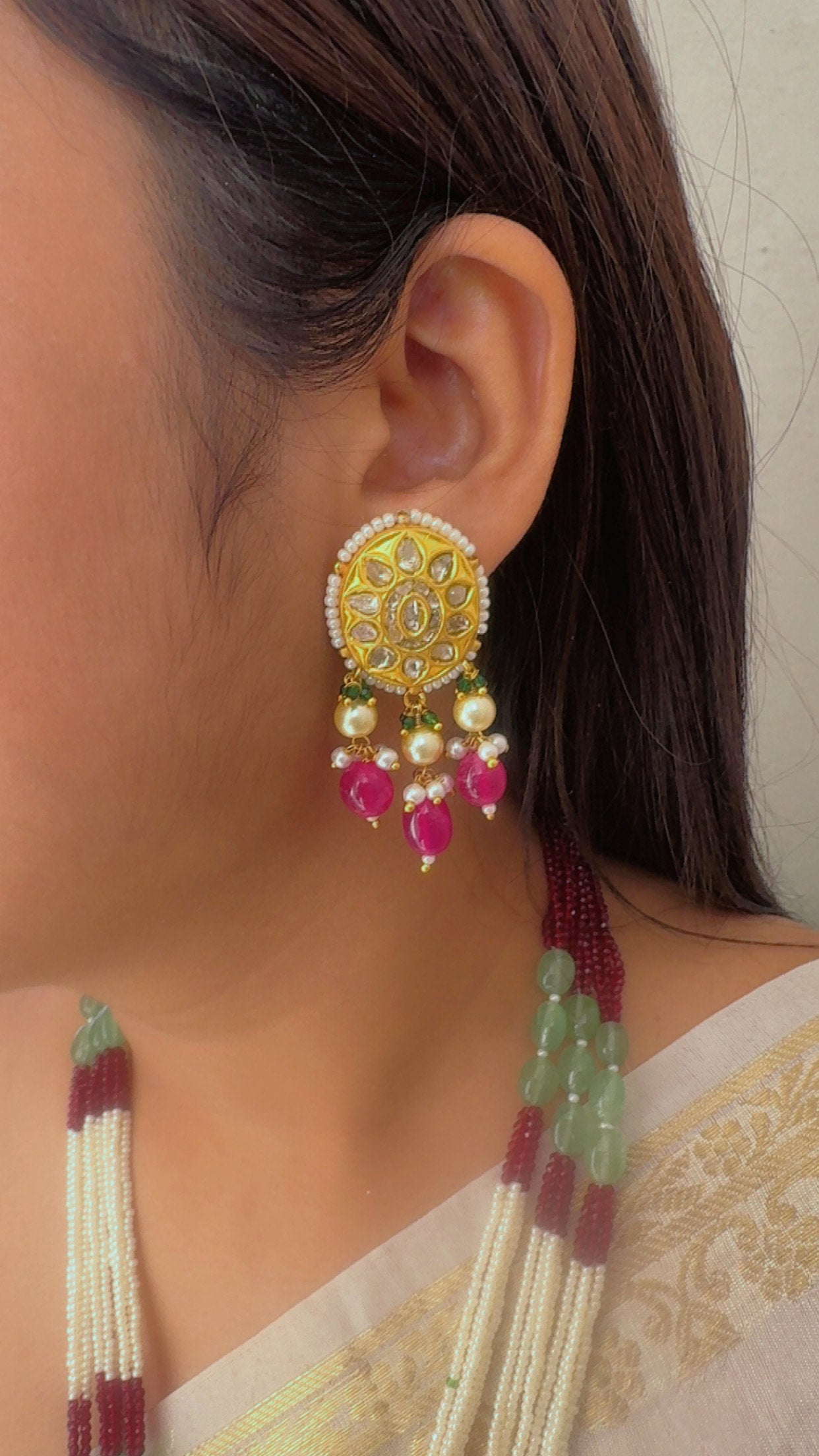Crafted in 22kt gold with natural polki diamonds and gemstones.