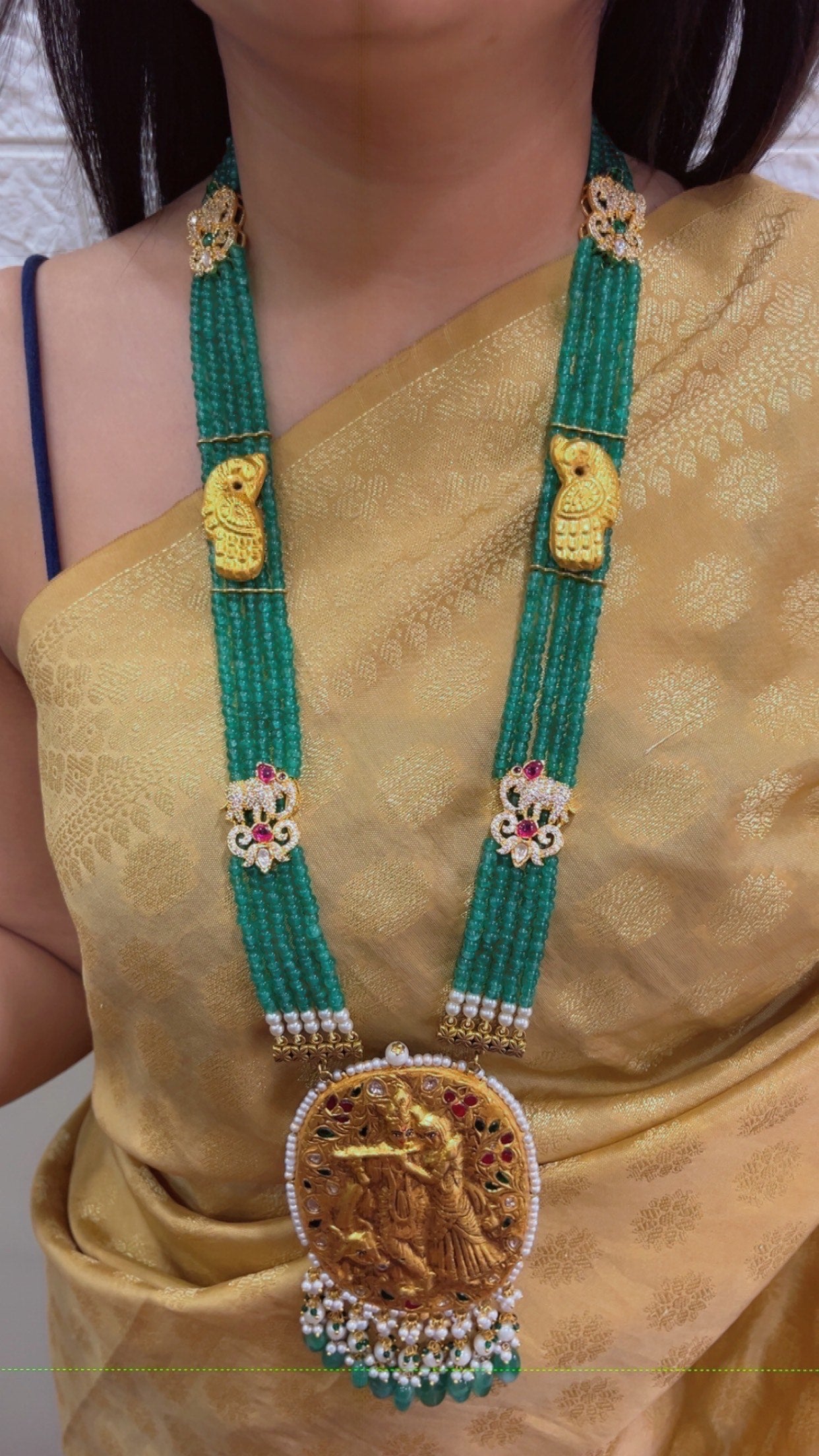 22K Gold Hallmarked Diamond Polki Radha Krishna Green Necklace Jewelry