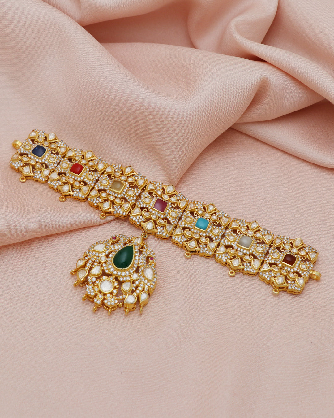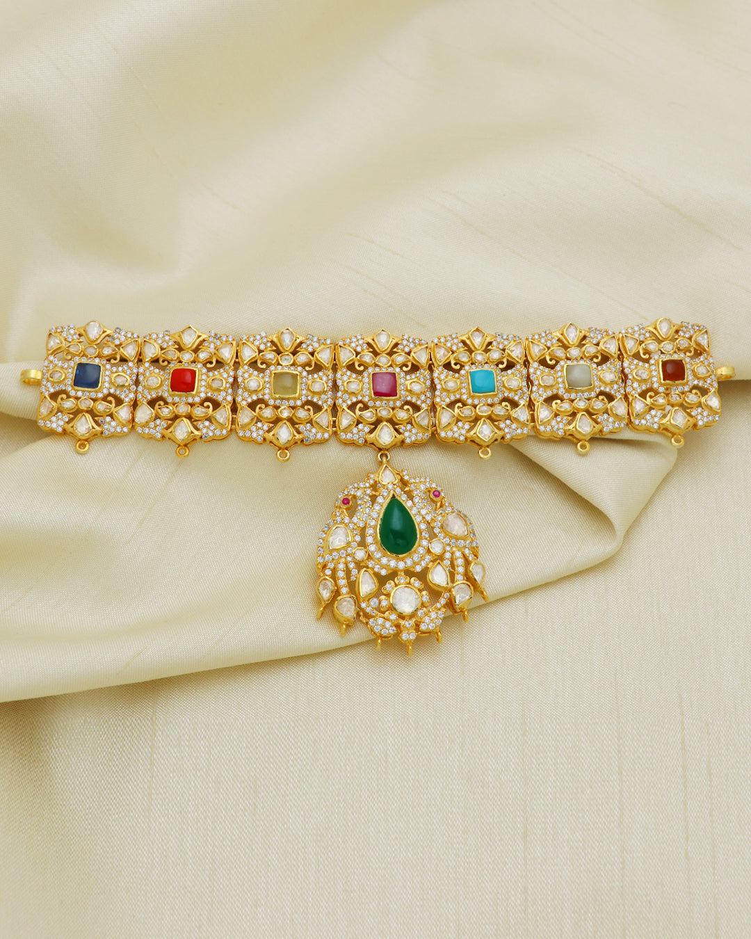 925 Silver Multi Color Gemstone Moissanite Polki Choker Necklace Weight - 50.9 Gram SKU:RG316 |