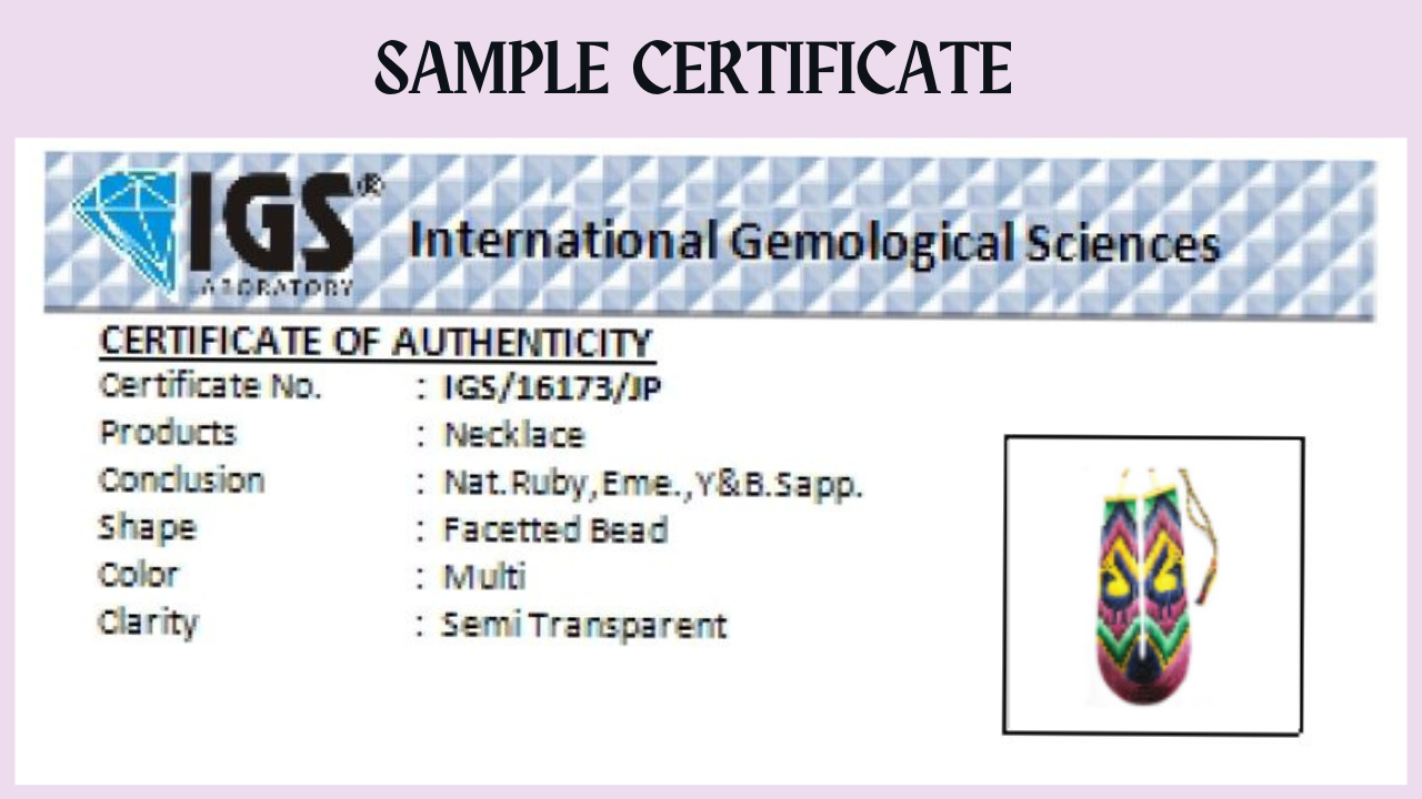 All Precious Beads and necklaces purchased will come with an authentic gem certificate from a renowned laboratory.
